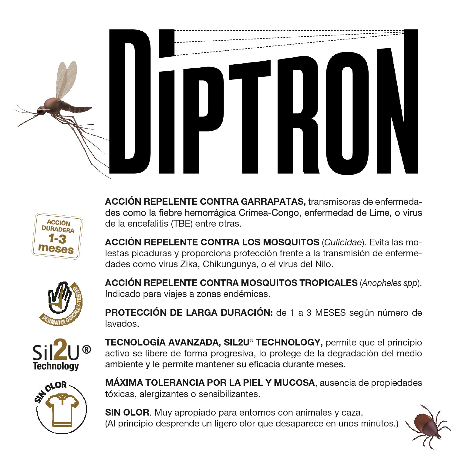 Textile Diptrón agit contre les tiques qui peuvent transmettre des maladies telles que la fièvre hémorragique de Crimée-Congo, le tilleul ou le virus de l'encéphalite entre autres, protège contre les moustiques en les empêchant de vous piquer et de transmettre le virus Sika, le Chikungunya ou le virus du Nil. moustiques, il est donc idéal pour les voyages dans les zones endémiques. Ce répulsif est parfait pour passer de chasse, aile Montagne, faire randonnée, battre air libre, dans Aires vertes ou effectuer voyage exotique.