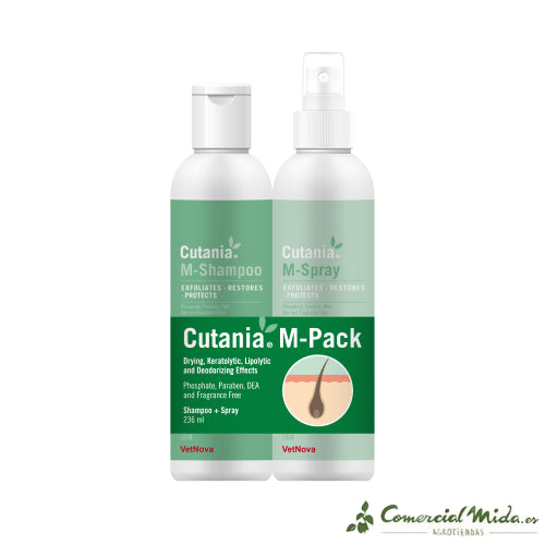 El VETNOVA CUTANIA M-Pack combina el CUTANIA M-Shampoo y el CUTANIA M-Spray en un tratamiento integrado para perros y gatos con pieles querato-seborreicas. El M-Shampoo, con ácido bórico y ácido glicólico al 2 % y ceramidas y glicerina para restaurar la barrera cutánea, ofrece una acción queratolítica, lipolítica y secante con efecto exfoliante profundo. El M-Spray complementa su acción con un formato Leave-On, Dry-On, permitiendo tratar zonas difíciles sin aclarado y prolongar la eficacia de los activos. Ambos productos son sin fragancia, libres de antibióticos, corticoides, fosfatos, parabenos y DEA, aptos para uso a corto o largo plazo y pueden reducir la frecuencia de los baños al potenciar mutuamente sus efectos.