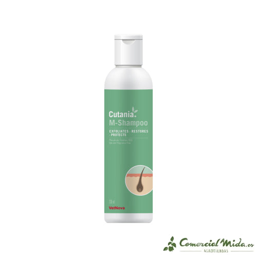 El VETNOVA CUTANIA M-Shampoo es un champú dermatológico sin fragancia, formulado con ácido bórico y ácido glicólico al 2 % cada uno para ofrecer una acción secante, queratolítica y lipolítica profunda. Incorpora ceramidas (0,5 %) y glicerina (0,5 %) que restauran el epitelio y refuerzan la barrera cutánea, mientras aportan hidratación. Su fórmula libre de antibióticos, corticoides, fosfatos, parabenos y DEA resulta segura tanto para perros como gatos, incluso en uso prolongado. Gracias al efecto exfoliante, mejora la penetración de los principios activos y optimiza el control de las pieles querato-seborreicas. Puede usarse de forma independiente o en combinación con el CUTANIA M-Spray para potenciar resultados.