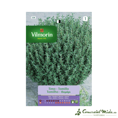 Les graines de thym de Vilmorin son semences aromatiques qui sont utilisés comme condiment et médecine. La plante a une forme d'arbuste avec tronc ligneux et des feuilles petites et arrondies. Elle a une couleur verte qui peut varier des teintes claires à d'autres plus intenses. Les fleurs du thym sont petites et d'une couleur lilas rosé. Les feuilles rehaussent les sauces, les rôtis et d'autres recettes et se conservent longtemps sèches dans des bocaux et des récipients. Il est recommandé de semer cette variété pendant les périodes de hiver-printemps-été et les récolter au printemps-été-automne, en essayant de maintenir la température ambiante autour de 18ºC. Son arôme agréable attire les abeilles et d'autres insectes volants.