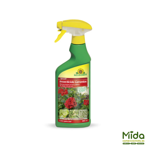 Neudorff Spruzit Insecticida Geranios RTU (500 ml) es un insecticida-acaricida listo para usar, especialmente adecuado para geranios y otras plantas ornamentales. Actúa contra plagas en todas sus fases (adultos, larvas y huevos), ayudando a cortar el ciclo de la infestación. Su fórmula combina piretrina de origen vegetal (de Chrysanthemum cinerariaefolium) con aceite de colza, mejorando la acción por contacto y la cobertura sobre la plaga. Está certificado para Agricultura Ecológica y se aplica mediante pulverización hasta humedecer visiblemente la planta. Para una eficacia completa, es clave tratar también la parte inferior de las hojas.