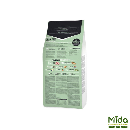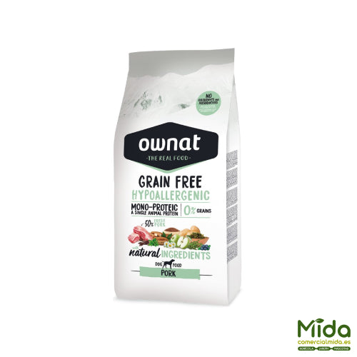 OWNAT Grain Free Hypo Pork es un alimento para perros formulado sin cereales y elaborado exclusivamente con carne de cerdo como única fuente de proteína animal, por lo que resulta una alternativa adecuada para discriminar alergias e intolerancias a otras proteínas mediante dietas de exclusión. Incorpora cerdo fresco como base de la receta, aportando proteínas de alto valor biológico, gran palatabilidad y un buen aprovechamiento de nutrientes. Se apoya en carbohidratos alternativos de alta digestibilidad (patata y mandioca), antioxidantes naturales (manzana y arándanos) y componentes funcionales como semilla de lino (omega-3), FOS/MOS, algas marinas y yucca, orientados al bienestar digestivo e intestinal.
