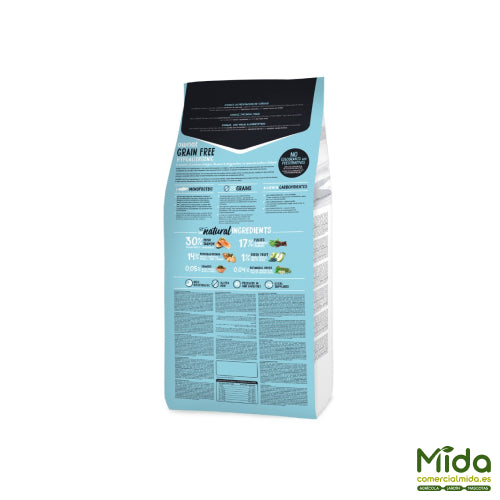 OWNAT Grain Free Hypo Salmon es un alimento de alta gama para perros, formulado con salmón como única fuente de proteína animal y una receta libre de cereales (Grain Free). Está pensado como una alternativa eficaz para discriminar alergias e intolerancias, al reducir potenciales alérgenos y simplificar la fuente proteica. Su perfil incluye ácidos grasos esenciales omega 3 y 6, claves para favorecer una piel sana y un pelo sedoso y brillante. Se complementa con ingredientes funcionales como FOS/MOS, yucca, antioxidantes naturales (manzana y arándanos) y algas marinas para soporte mineral.