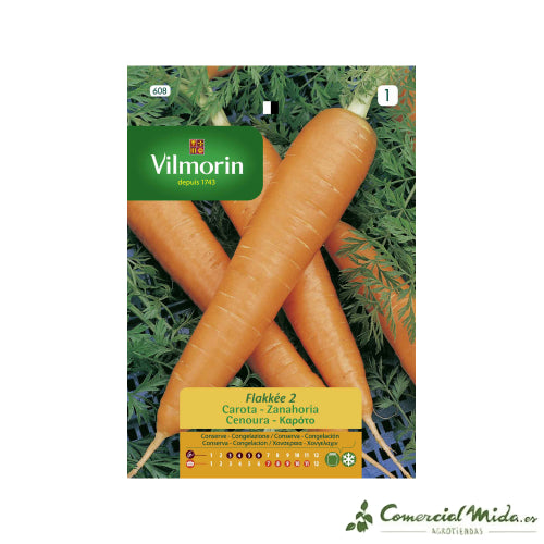 Les semences de Vilmorin sont semences de culture facile. La variété Flakkée c'est un type de carotte de grande taille, forme légèrement conique et tronquée. Il a une douce couleur orange et un haute teneur en solides solubles. Il est hautement résistant au gel et est très utilisée pour le stockage à l'état naturel dans la agro-industrie de congélation et de conservation. Ce type de carotte est épais, d'environ 18-20 cm de long et de bon goût. De semis annuel et avec feuillage robuste et vigoureux, de haute qualité et pureté à 98%. Se distingue par son excellente coloration interne et externe, ses racines cylindriques et longues et bonne germination.
