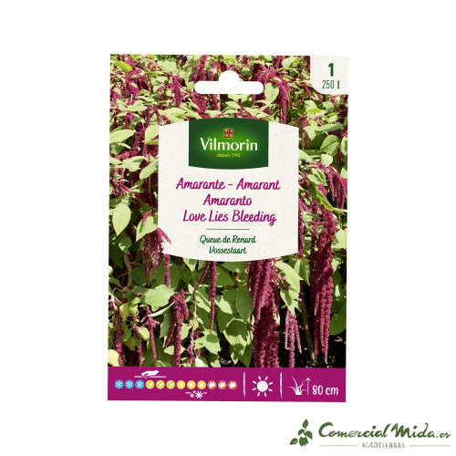 El Amaranto Cola de Zorro de Vilmorin es una planta ornamental espectacular, conocida por sus inflorescencias colgantes de color violeta intenso que ofrecen un impacto visual único en jardines y arreglos florales. Su follaje verde claro crea un hermoso contraste, haciendo de esta variedad una elección perfecta para macizos, macetas y ramos secos. Adaptada a todo tipo de suelos, esta planta anual es resistente y decorativa, ideal para jardineros que buscan originalidad.